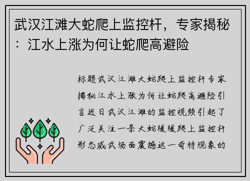 标题:武汉江滩大蛇爬上监控杆,专家揭秘:江水上涨为何让蛇爬高避险 【引言】 近日,武汉江滩的监控视频引起了广泛关注。一条大蛇缓缓爬上监控杆,形态威武,场面震撼。这一奇特现象的出现,背后不仅仅是蛇的生物...